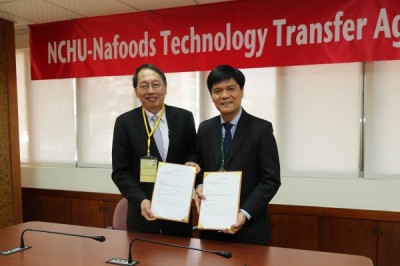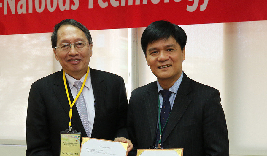 興大植物病理學系教授葉錫東(左)與越南Nafoods公司總裁Ngayen Manh Hung簽署技轉合約。(photo by 興大公關組)