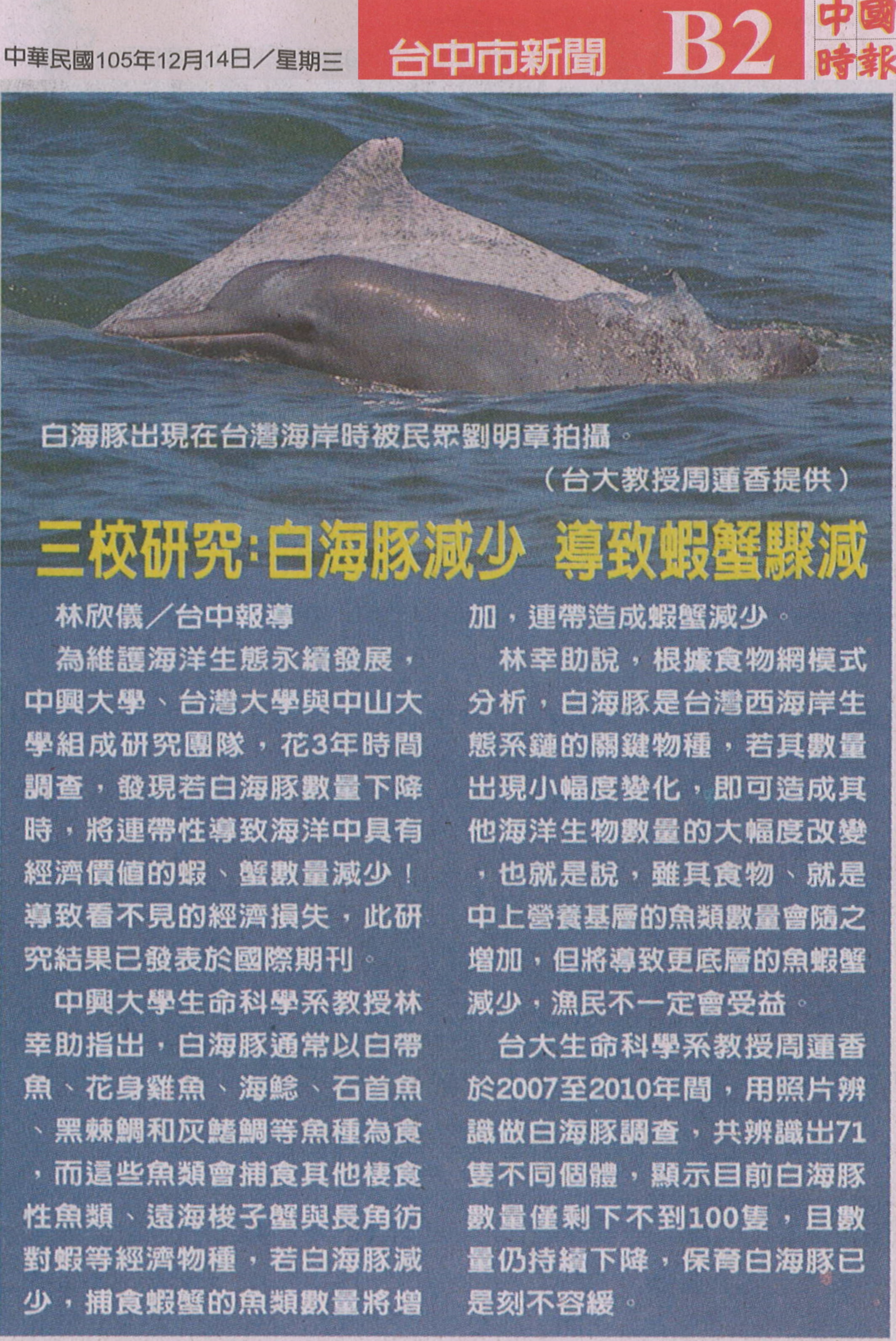 中興大學、台灣大學、中山大學所組的研究團隊,歷經3年發現當台灣西海岸的中華白海豚數量下降時,海洋中、上營養階級魚類增加,但高經濟價值魚蝦蟹數量恐下降。