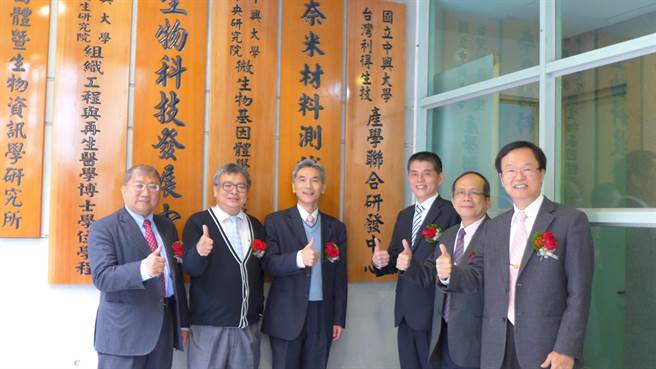 圖說,台灣利得生物科技與中興大學攜手設立產學聯合研發中心,今(16)日舉行揭牌儀式,圖左至右,包括台灣利得總經理陳啟祥、興大森林學系教授王升陽、興大校長薛富盛、台灣利得董事長林進忠、興大副校長黃振文,及興大農資學院院長陳樹群等人,親自到場揭牌。(圖/興大提供)