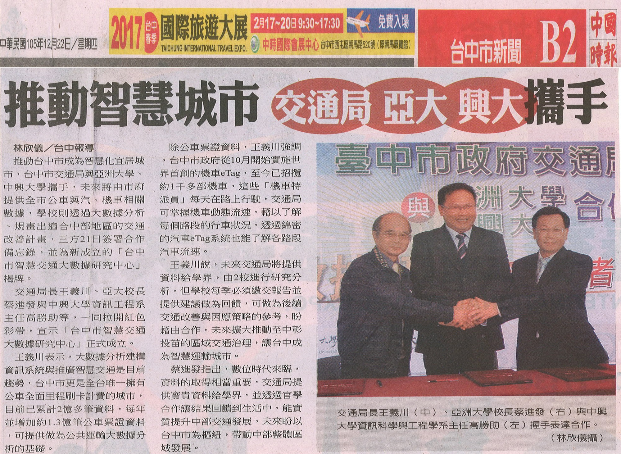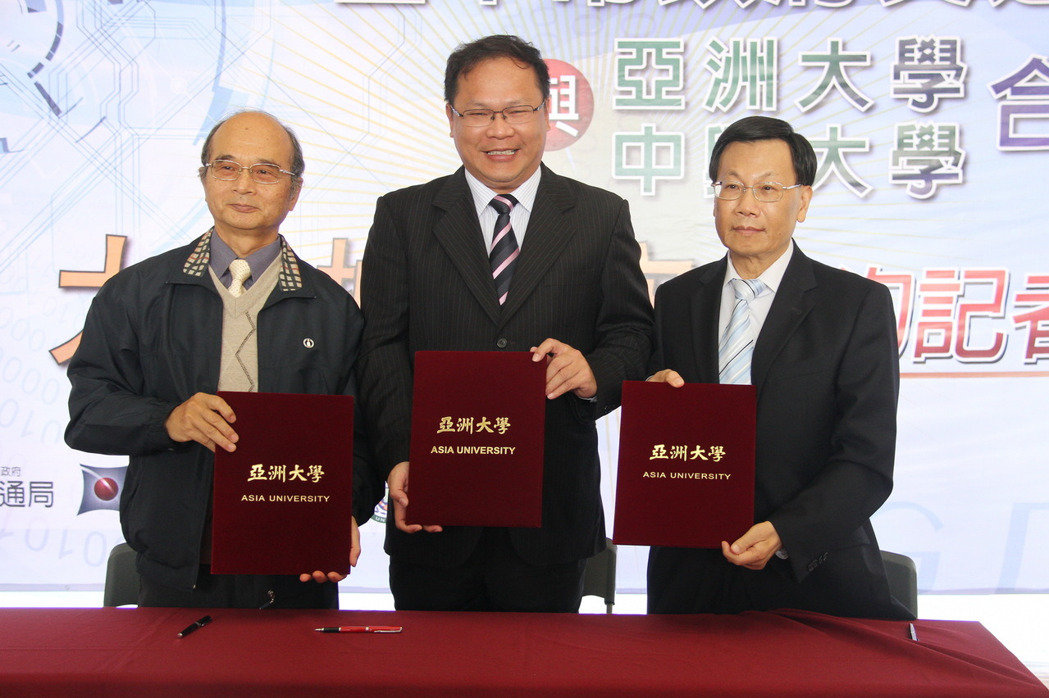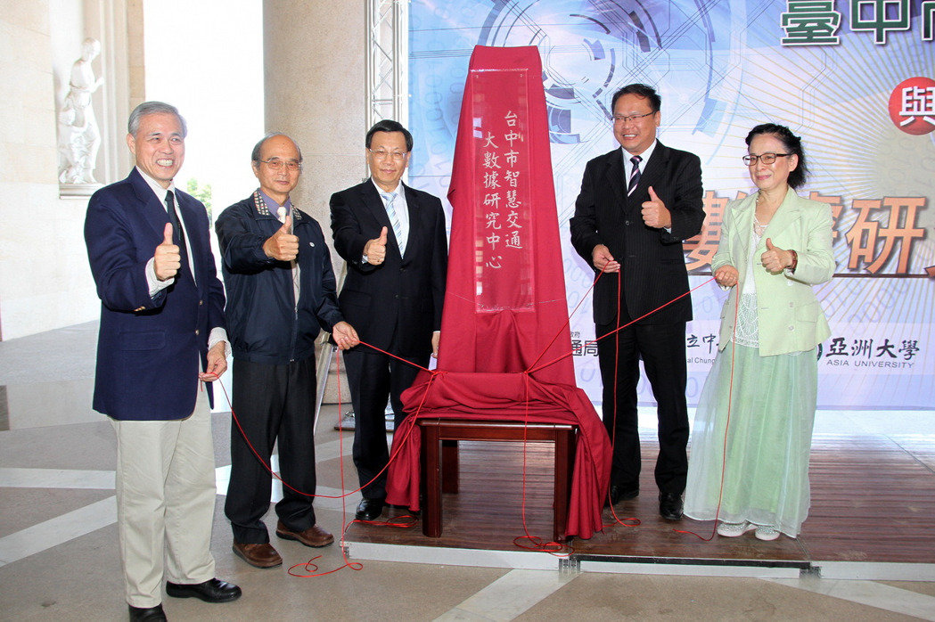台中市交通局長王義川、亞大校長蔡進發、中興大學資訊科學與工程系主任高勝助於上午9時在亞洲大學圖書館前廣場共同簽署合作備忘錄後,並與亞洲大學副校長林蔚君、資電學院院長連耀南等,共同為成立「台中市智慧交通大數據研究中心」揭牌。