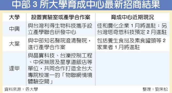 中部3所大學育成中心最新招商結果