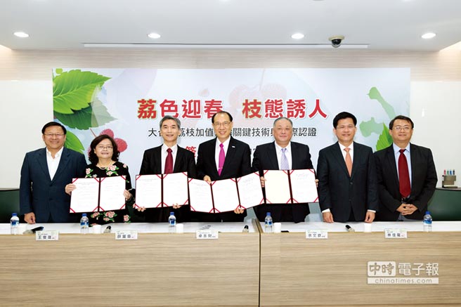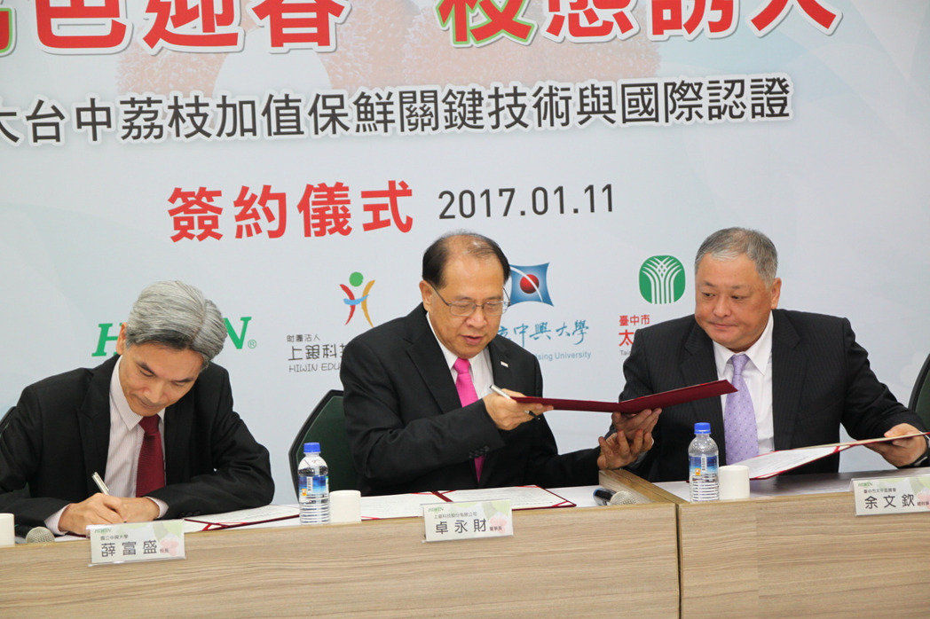 上銀今天在台中市精密機械科技創新園區總部舉行「荔枝加值保鮮關鍵技術移轉與國際認證」簽約儀式,在台中市長林佳龍見證下,由卓永財與中興大學校長薛富盛、太平區農會總幹事余文欽等人共同簽署。