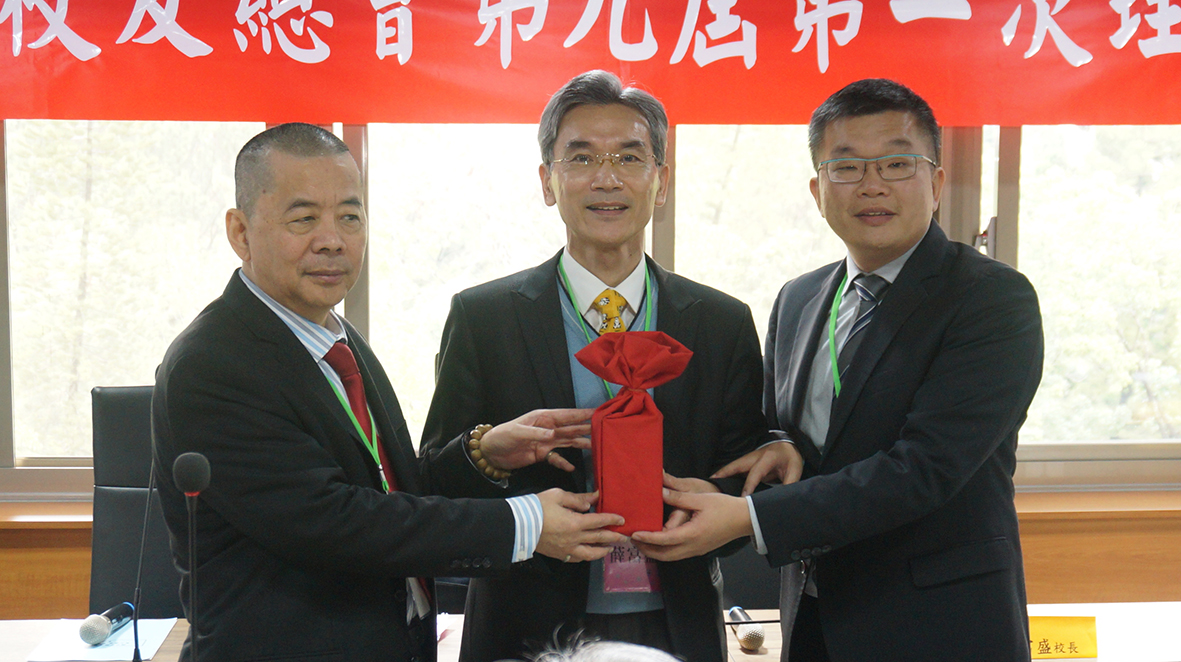 在薛富盛校長見證下,第九屆校友總會蔡其昌理事長(右)從林萬年前理事長手中接下校友總會的責任與傳承。