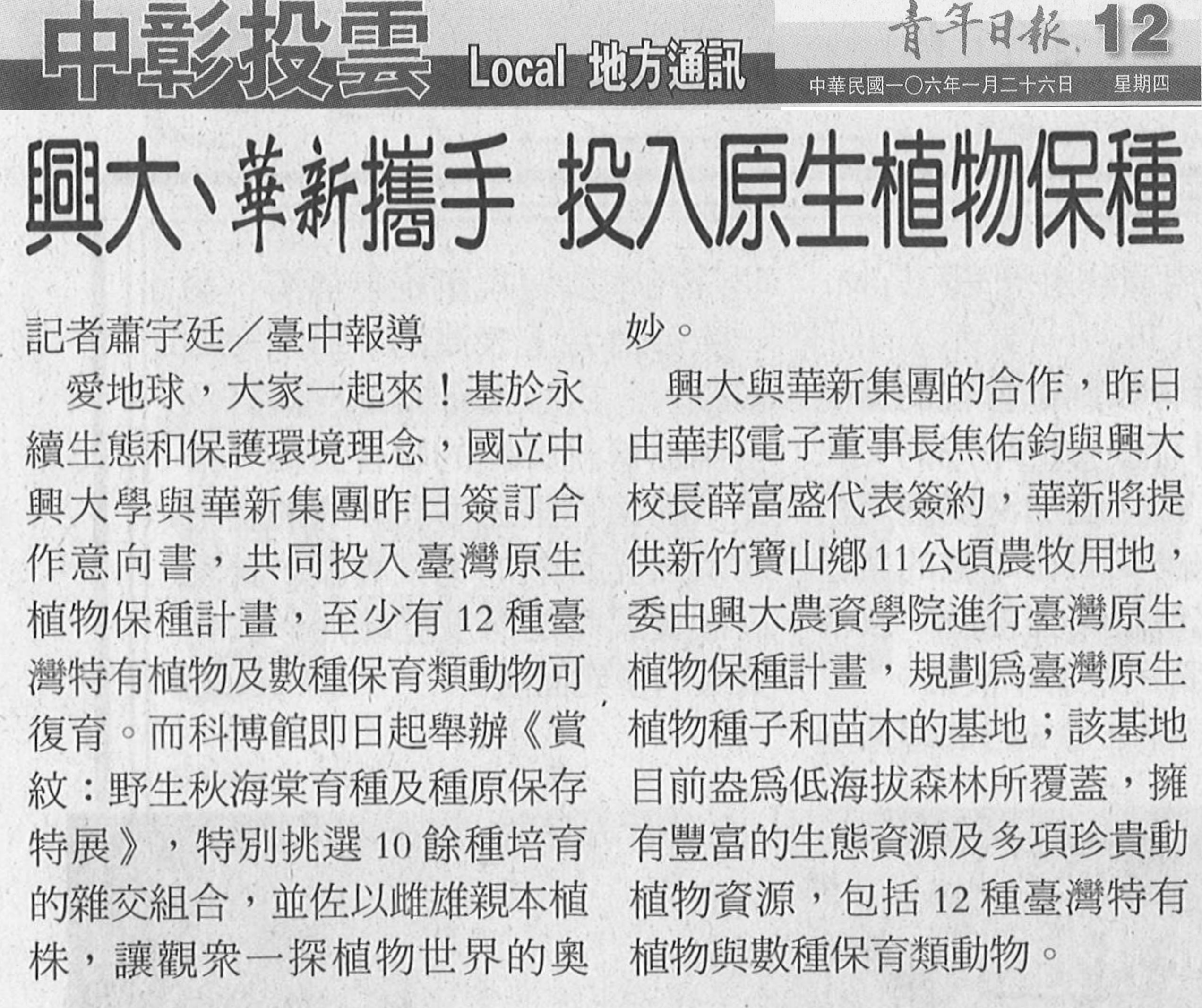 為落實台灣原生植物保育,華新集團與中興大學兼天簽訂合作意向書,將提供新竹農牧用地,委由興大農資學院進行台灣原生植物保種計畫,將規劃為台灣原生植物種子和苗木的基地,預期可營造出低海拔珍貴的健康森林。