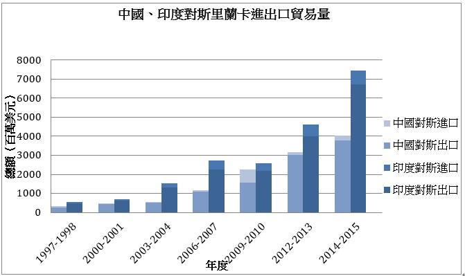 中國、印度對斯里蘭卡貿易趨勢(見備註 [3])。