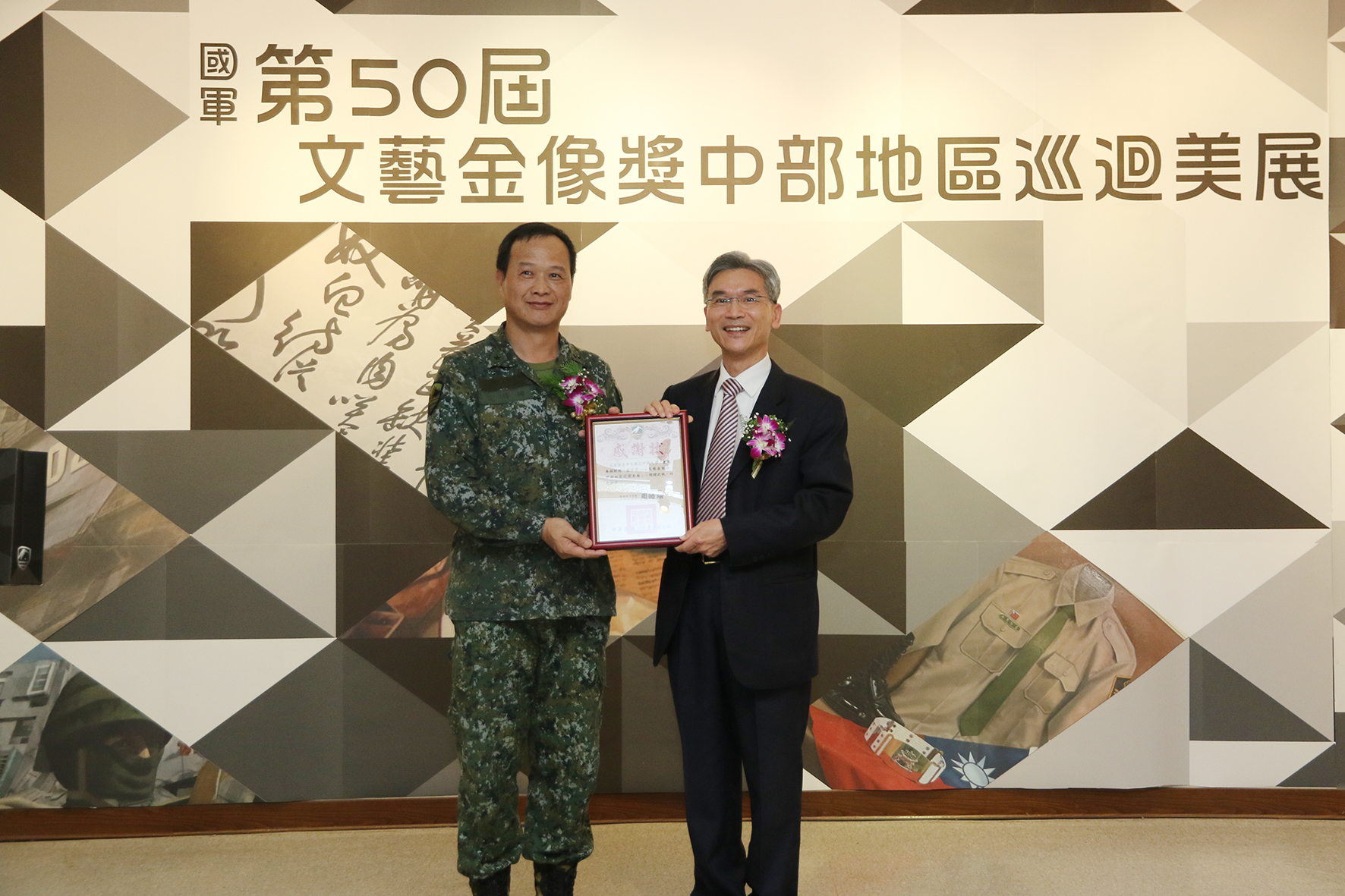陸軍十軍團政戰主任范輝坤少將(左)頒發感謝狀給中興大學校長薛富盛,感謝學校大力協助策展。【活動相簿】 國軍第50屆文藝金像獎中部巡迴美展,共展出30幅國畫、書法、西畫、漫畫、攝影等美術類得獎作品。 現場邀請書畫大師黃登貴揮毫。