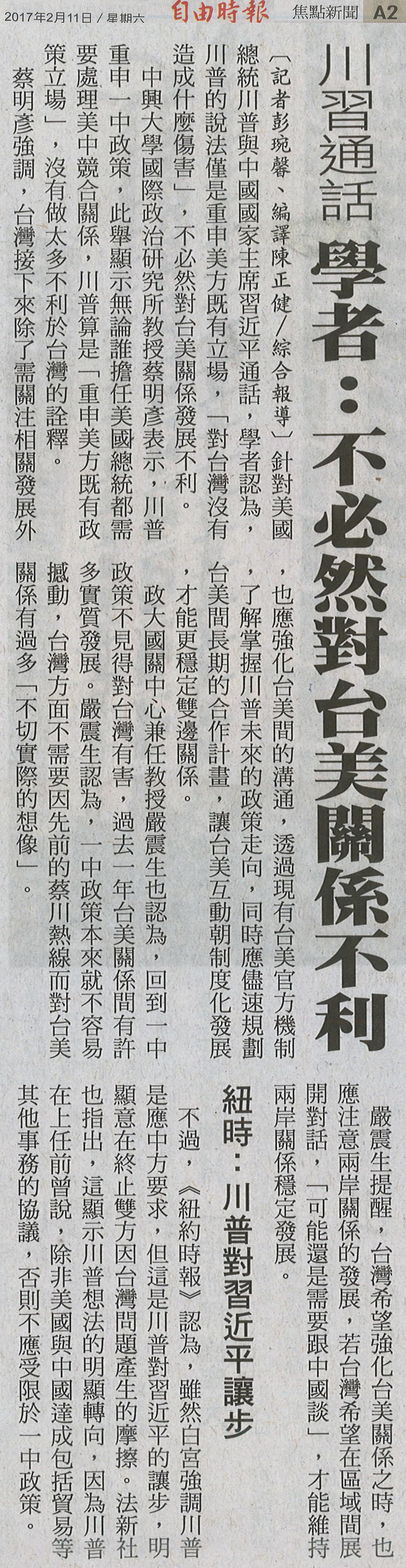 針對美國總統川普與中國國家主席習近平通話,學者認為,川普的說法僅是重申美方既有立場,「對台灣沒有造成什麼傷害」,不必然對台美關係發展不利。