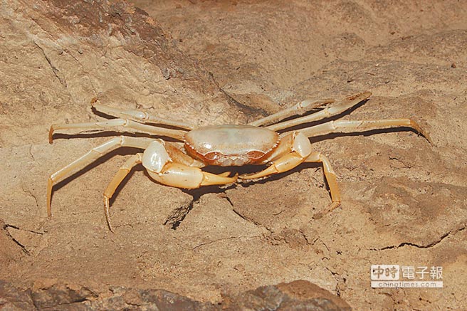 臘白地獄溪蟹由於長期適應於無光線環境,其眼柄已經退化、體色缺乏色素而呈現臘白色。(黃超提供)