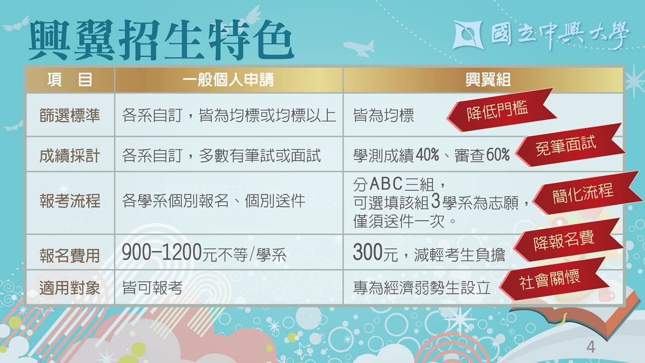 興翼招生是為經濟弱勢生設立的專組,包含低收入戶、中低收入戶、特殊境遇家庭子女、或經由校長證明確實為經濟弱勢者,分為A(含商管相關學系)、B(含理、工等相關學系)、C(含農學、生科、獸醫等相關學系)三組,共釋出22個招生名額,各科皆採計均標,降低篩選標準,同時免筆試、免面試,學測成績占40%、書面審查60%,考生選報一組可填選3個學系為志願,不必個別報考送件,簡化甄試流程。且降低報名費至300元,與目前每學系約900-1200元報名費相較,可大幅減少學生報考的負擔。