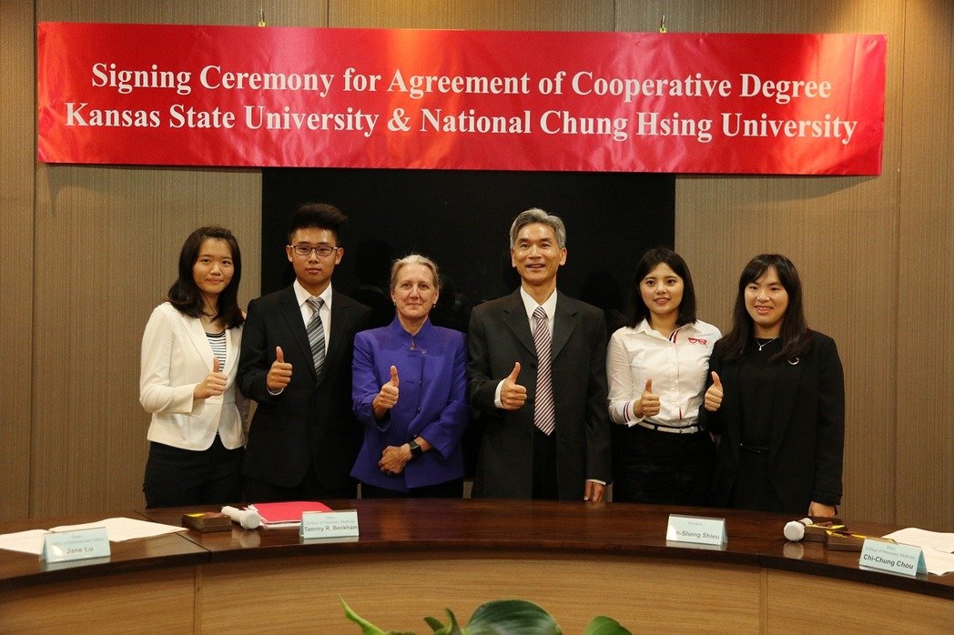國立中興大學和中部地區53所高中職組成「興中會」聯盟,也積極與海外大學合作。圖為中興大學與美國堪薩斯州立大學簽訂獸醫雙聯學位。