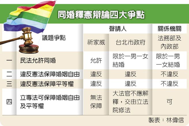 司法院今(24)日舉行同婚釋憲案憲法法庭,2015年美國聯邦最高法院判決同婚合法的案例,成為討論焦點。中興大學法律系教授李惠宗表示,婚姻應該是一種制度,不該被認為是權利。