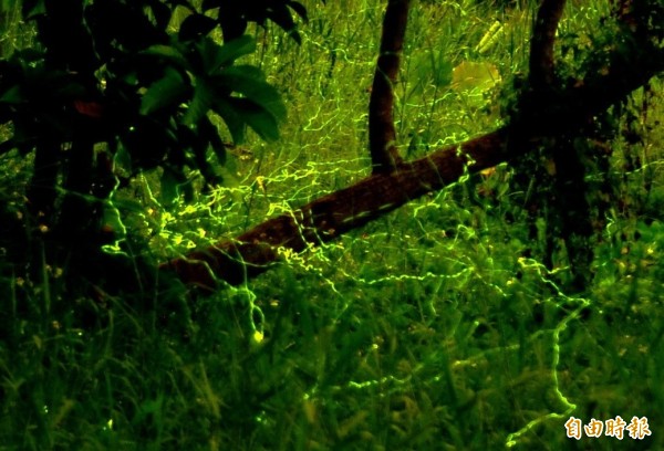 火金姑成群飛舞,透過鏡頭猶如螢光線絲飄逸在林間。(記者吳俊鋒攝)