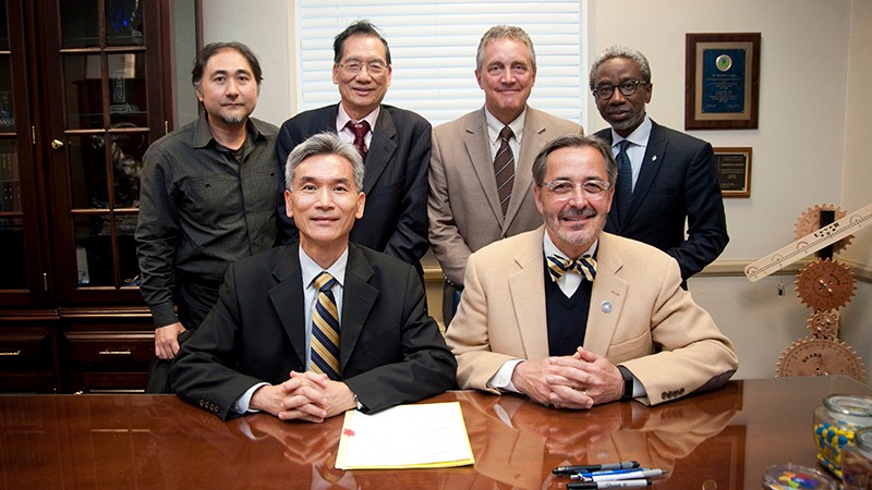 Celebrating the agreement signing are (seated, from left) Fuh-Sheng Shieu, president of the National Chung Hsing University, and UD Provost Domenico Grasso, with (standing from left) Tian-Jian Hsu, associate professor of civil and environmental engineering at UD; C.P. Huang, the Donald C. Phillips Professor at UD; Tripp Shenton, chair of UD's Department of Civil and Environmental Engineering; and Babatunde Ogunnaike, dean of UD's College of Engineering.