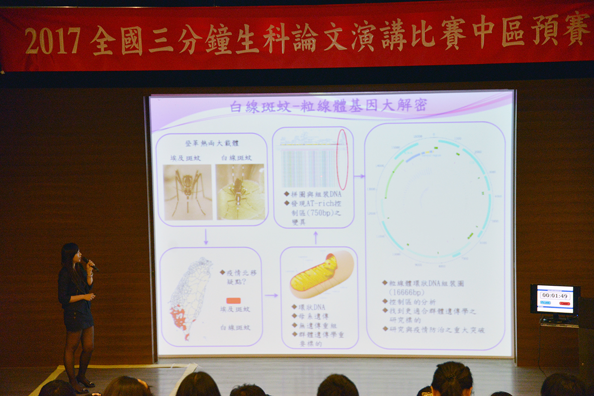 2017全國三分鐘生科論文口說競賽 (3MTLS) 5月6日於興大生科院舉行中區預賽,共有32位校內外學生參賽。此競賽運用近來流行的「懶人包」概念,參賽者自選生命科學相關主題,在規定三分鐘內,以完整表達、清晰口條、生動的描述介紹論文內容,包含主題選定、內容鋪陳、口條台風、觀眾興趣皆是評分項目,最後選出9位參賽者進入全國總決賽。