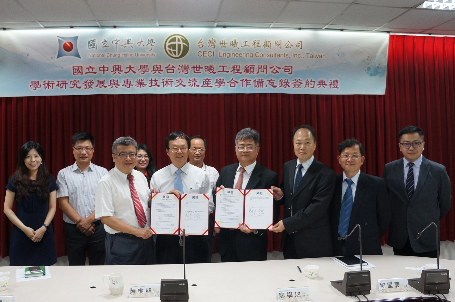 此次簽約儀式,參與的貴賓包含:興大農資學院副院長兼景憩學程主任王升陽、景憩學程助理教授張伯茹、園藝系副教授吳振發、生物產業管理研究所副教授蔡必焜、森林系副教授柳婉郁,台灣世曦運輸土木部協理劉國慶、經理蕭勝雄、葉曉蓁正工程師及林宏毅工程師等。