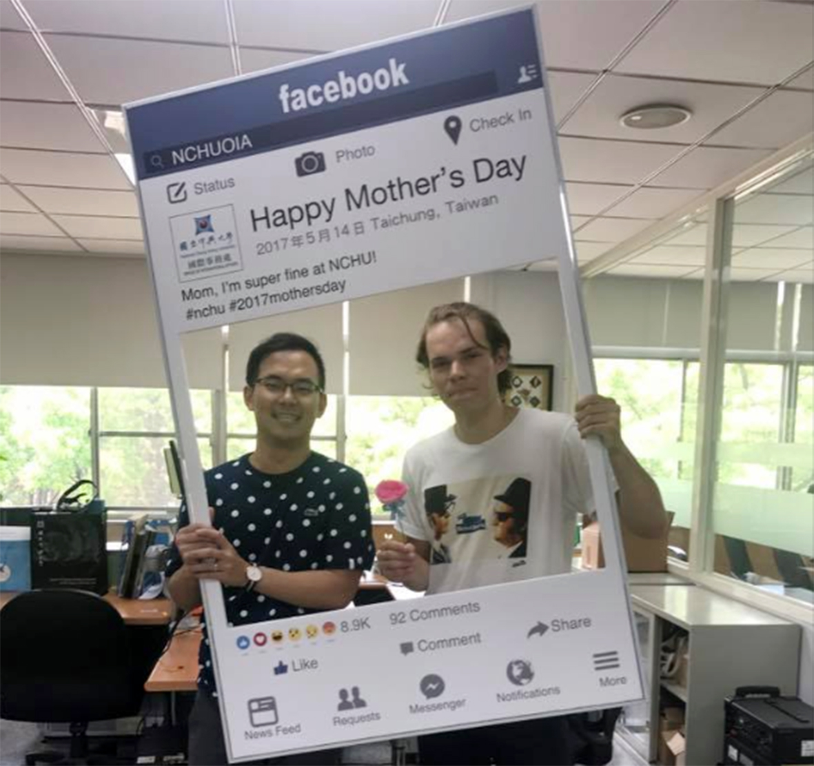 歡慶母親節,中興大學國際處5月8至12日舉辦「#mom I <3 U」(mom I love you)活動,讓國際學生自製康乃馨,同時在國際處辦公室設有「我愛媽咪」臉書打卡站,讓國際生可打卡上傳照片,透過網路對母親表情意。
