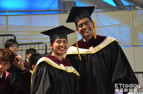 2011年來台攻讀地球科學研究所的Suranjith和Amali。上圖為兩人的碩士畢業典禮。(圖/Suranjith提供)