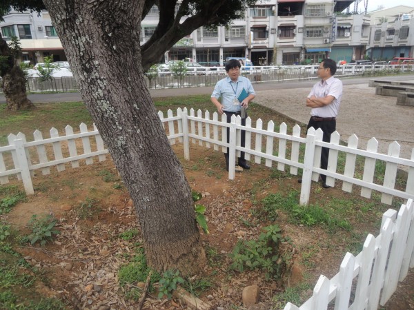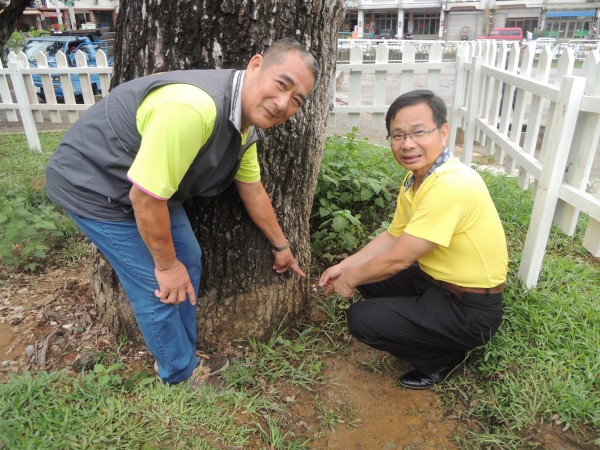 市議員陳清龍(右)與后里區墩東里長郭登豐(左)邀請專家對后里運動公園的楓樹進行「健檢」。