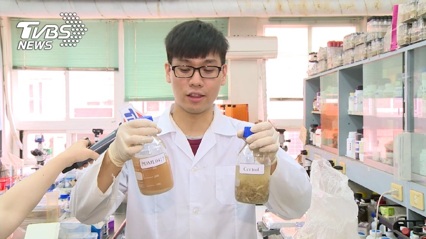 中興大學植病所學生林庭緯:「它只有加水,沒有額外添加細菌,所以可以看到它就算搖幾天之後,它的羽毛仍然沒有分解,那右邊這個是有加名為PDML0417的細菌,可以看到加下去之後搖2、3天,它的羽毛就完全分解了。」
