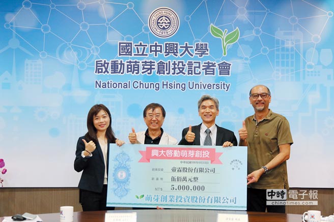 中興大學昨(13)日啟動萌芽創投,首宗投資案將投資帝霖公司500萬元。圖左至右為帝霖公司執行長楊佳慈、萌芽創投董事長王國雄、興大校長薛富盛,及技術發明人興大生科院副院長黃介辰。 |