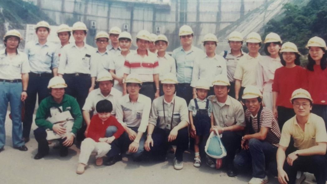 民國73年左右,由輸工處六段段長蔡豐隆帶台電員工去翡翠水庫參觀,前排蹲著右二為陳文望。 圖/台電提供