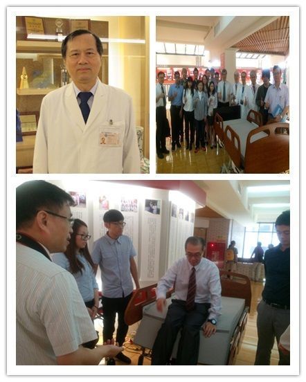 台中榮總院長許惠恒(左上)主持105年度成果發表會、副院長呂炳榮親自體驗可翻身下床的病床(下)、大葉大學材料科學與工程學系賴峰民、王正賢主任與研發團隊合照。 翁永全/攝照
