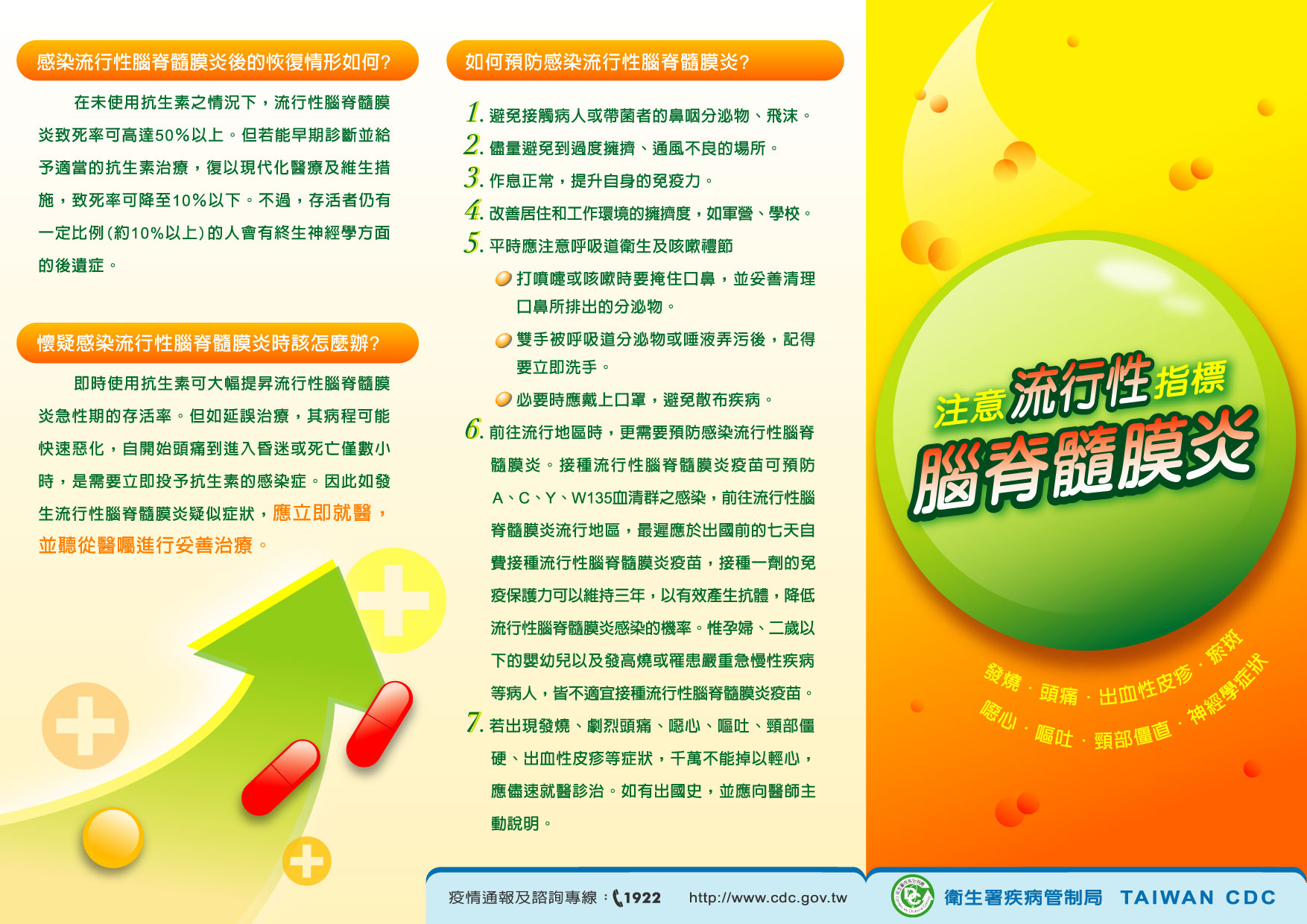 請保持個人良好衛生習慣如勤洗手及注意咳嗽禮節,妥善處理口鼻分泌物,並於處理後立即洗手;維持室內空氣流通,避免到過度擁擠、通風不良的場所。如計劃至流行性腦脊髓膜炎流行地區,請先至國內旅遊醫學門診諮詢評估接種疫苗,旅遊時保持良好個人衛生習慣,以降低感染機率,返國後如出現疑似症狀應立即就醫,並主動告知近期旅遊史。相關資訊可至疾管署全球資訊網(http://www.cdc.gov.tw)查詢或撥打國內免付費防疫專線1922(0800-001922)洽詢。