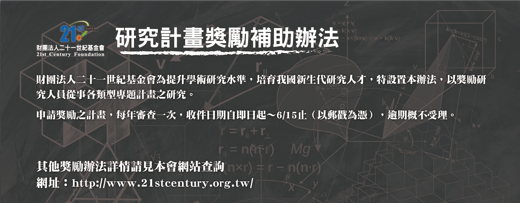 主 旨:本會為鼓勵優秀青年學者,開辦「 財團法人二十一世紀基金會研究計畫獎勵辦法」一案,自即日起至6 月15日。敬請協助轉知貴單位相關研究人員與教師。