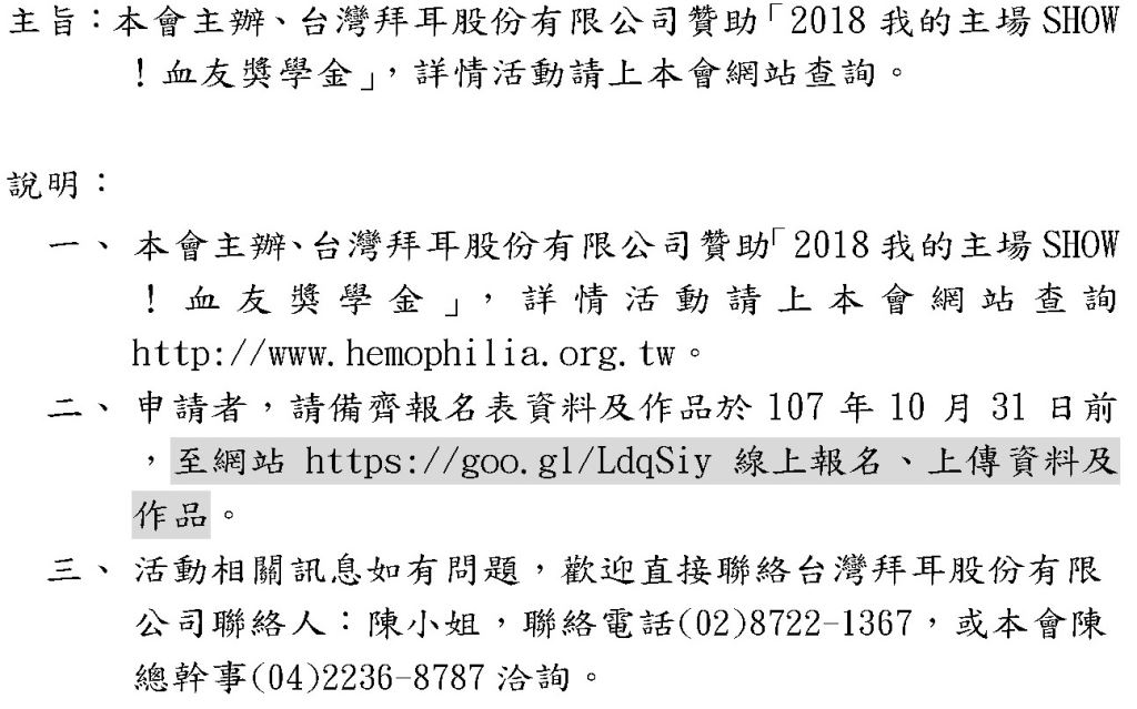 依社團法人台灣省關懷血友病協會107年10月5日血友鈿字第107051號函辦理。