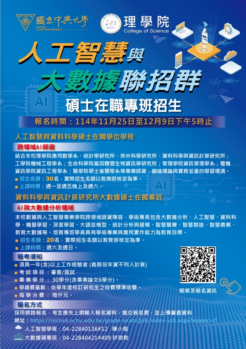 115學年度【人工智慧與大數據聯招群】碩士在職專班熱烈招生中!
