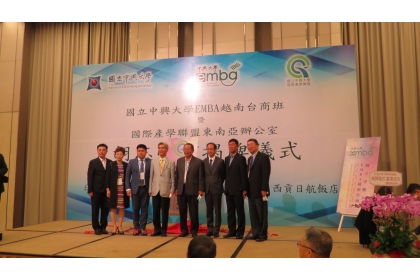 中興大學國際產學聯盟東南亞-胡志明辦事處暨EMBA越南台商班揭牌儀式,由興大校長薛富盛、國際產學聯盟徐新宏執行長、越南辦公室Brian代表、管理學院詹永寬院長、EMBA紀信義執行長、台北駐胡志明市經濟文化辦事處鍾文正處長、土龍木大學校長、台灣商會沈憲煜總會長、李天柒僑務委員及劉美德僑務委員等人共同揭牌。