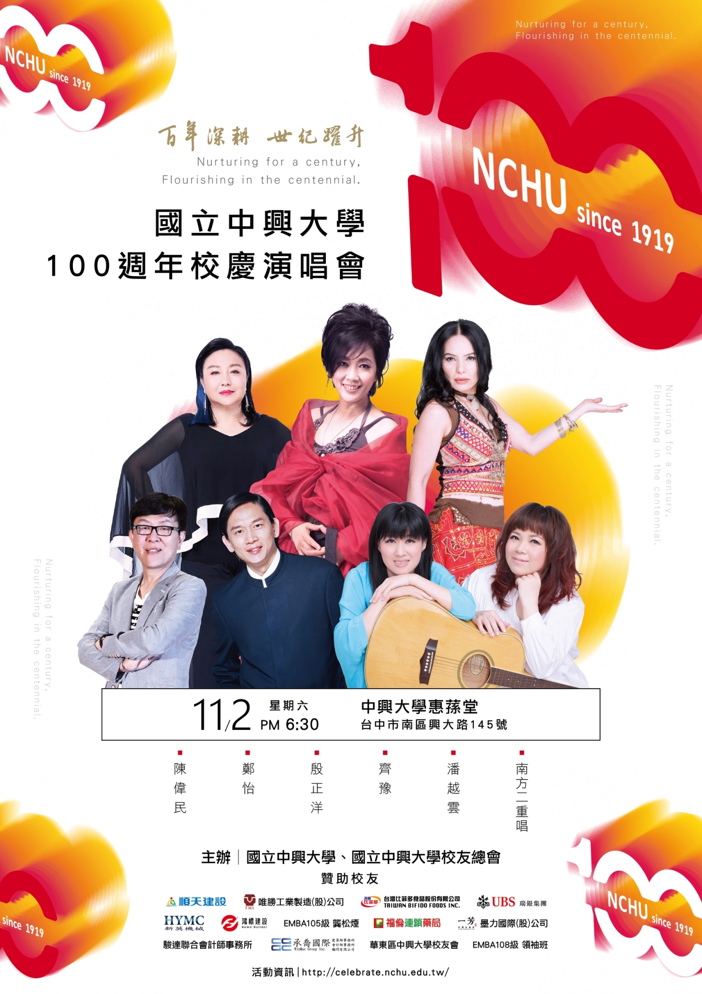 為慶祝本校建校百年校慶,謹訂於11月2日晚上6:30舉辦百年校慶演唱會,係學校與校友總會共同專為本校教職員工辦理的民歌享宴,誠摯邀請您蒞臨聆聽。