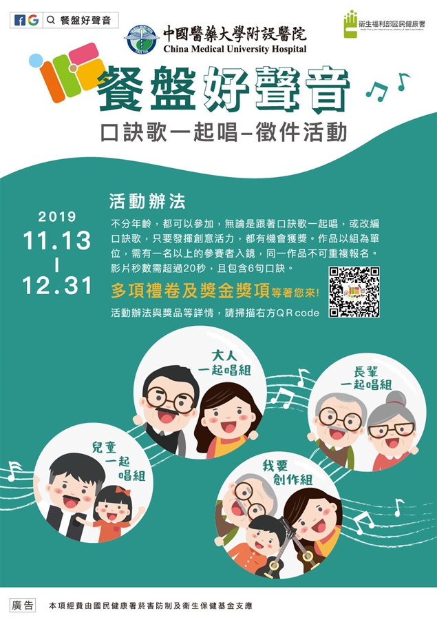 當然,國民健康署還要讓你盡情發揮熱情及創意,隆重推出「餐盤好聲音」口訣歌一起唱活動,不論想要跟著唱,或是改編歌曲,都可以來投稿作品拼大獎!