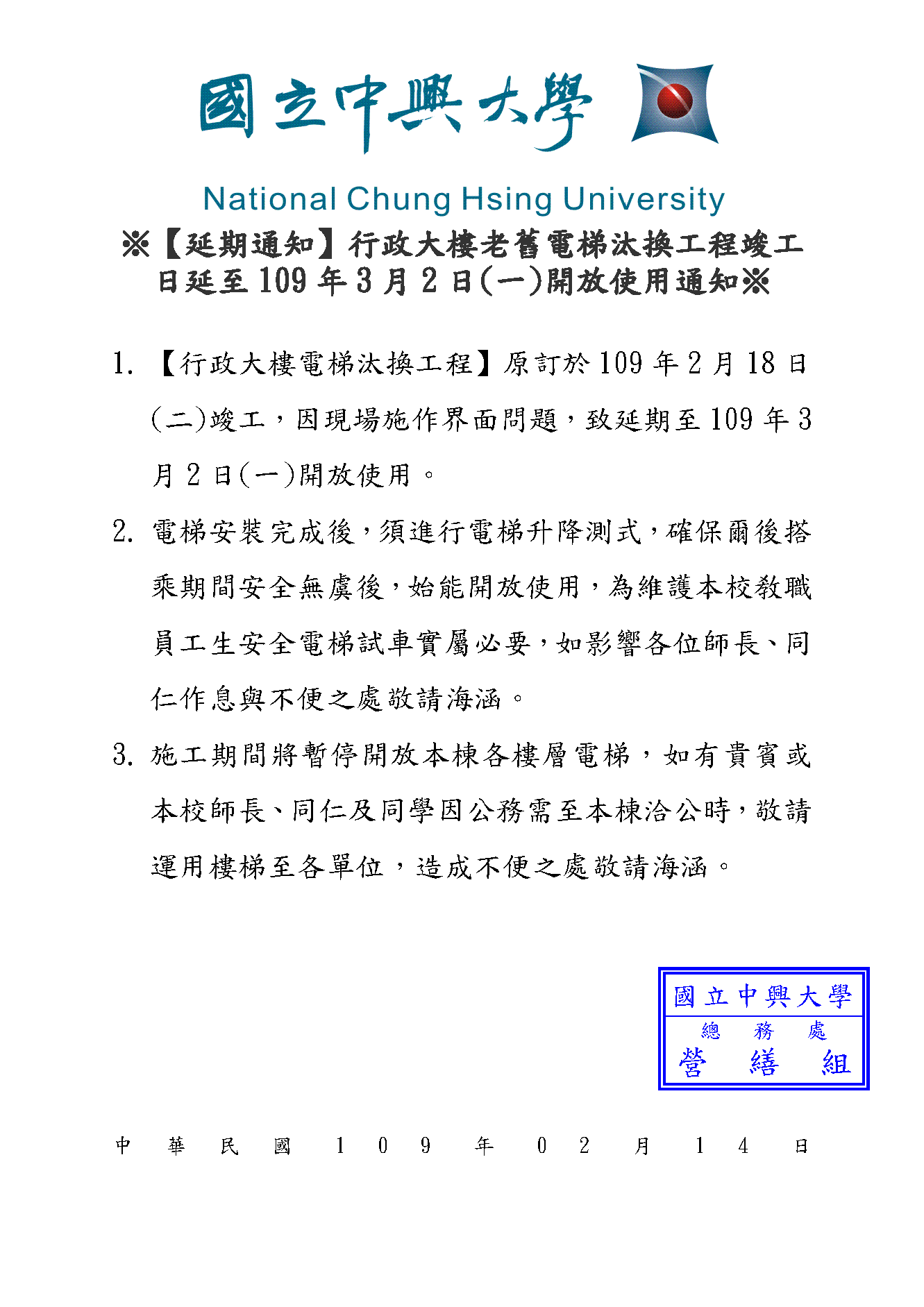 - 【行政大樓電梯汰換工程】原訂於109年2月18日(二)竣工,因現場施作界面問題,致延期至109年3月2日(一)開放使用。