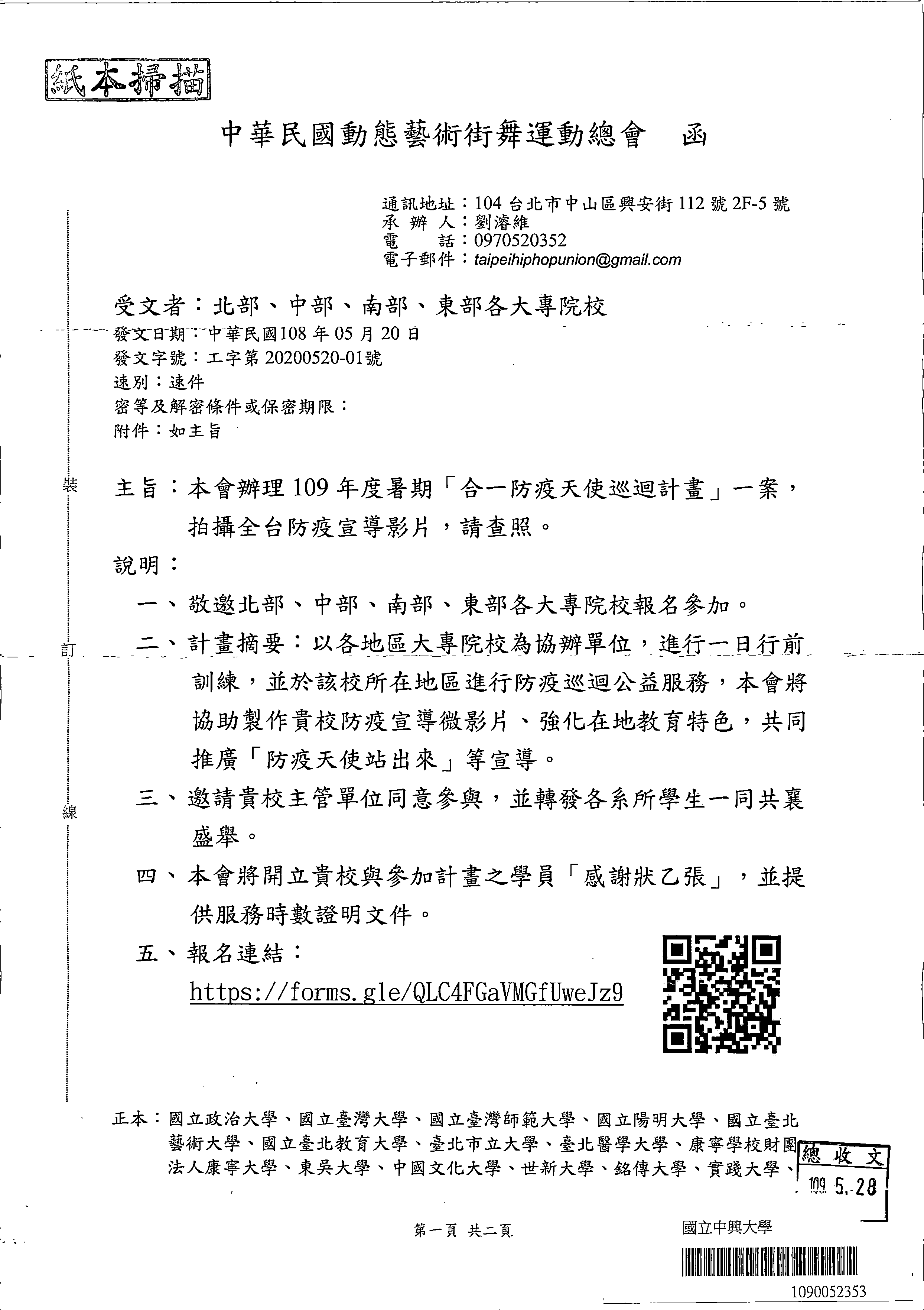 【轉知】中華民國動態藝術街舞運動總會辦理109年度暑期「合一防疫天使巡迴計畫」,拍攝全台防疫宣導影片