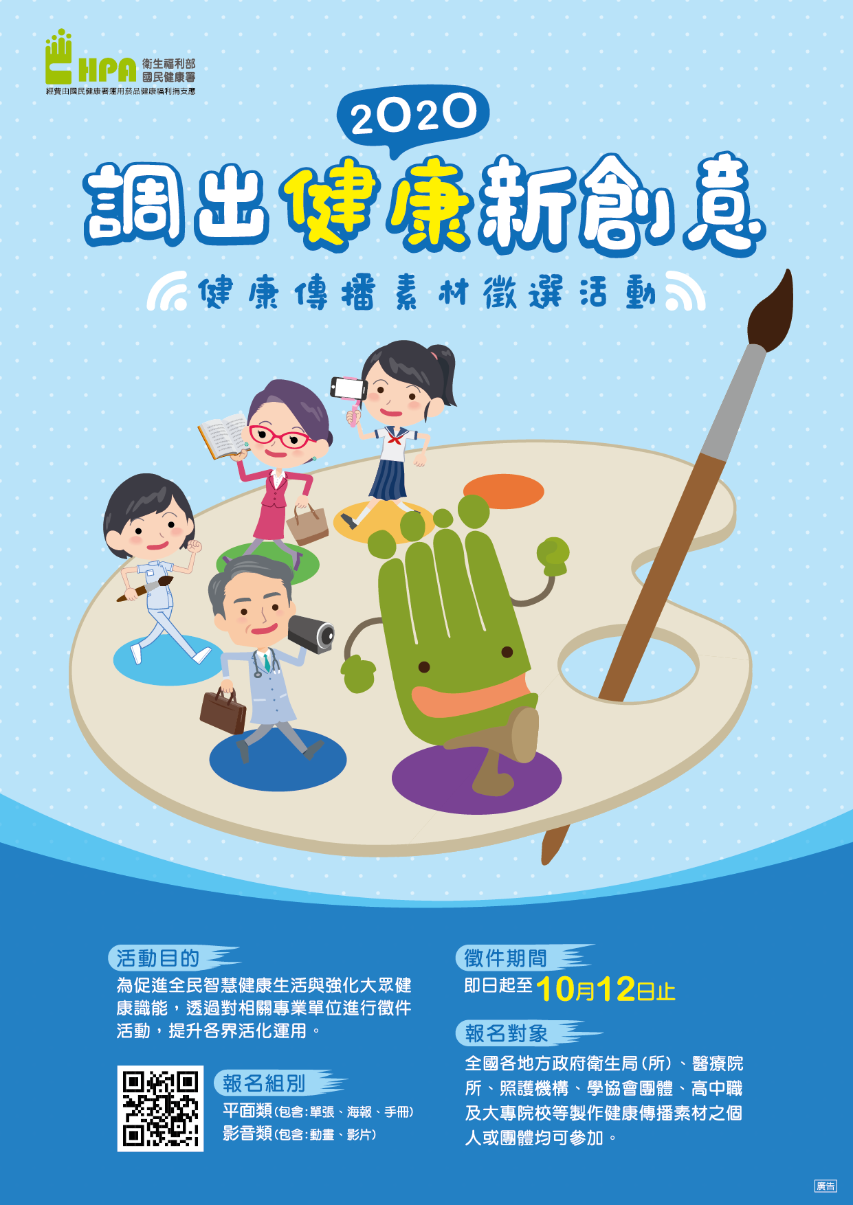【轉知】衛生福利部國民健康署辦理「2020調出健康新創意-健康傳播素材徵選活動」辦法及海報電子檔(如附件),請轉知大專校院學生踴躍報名參加