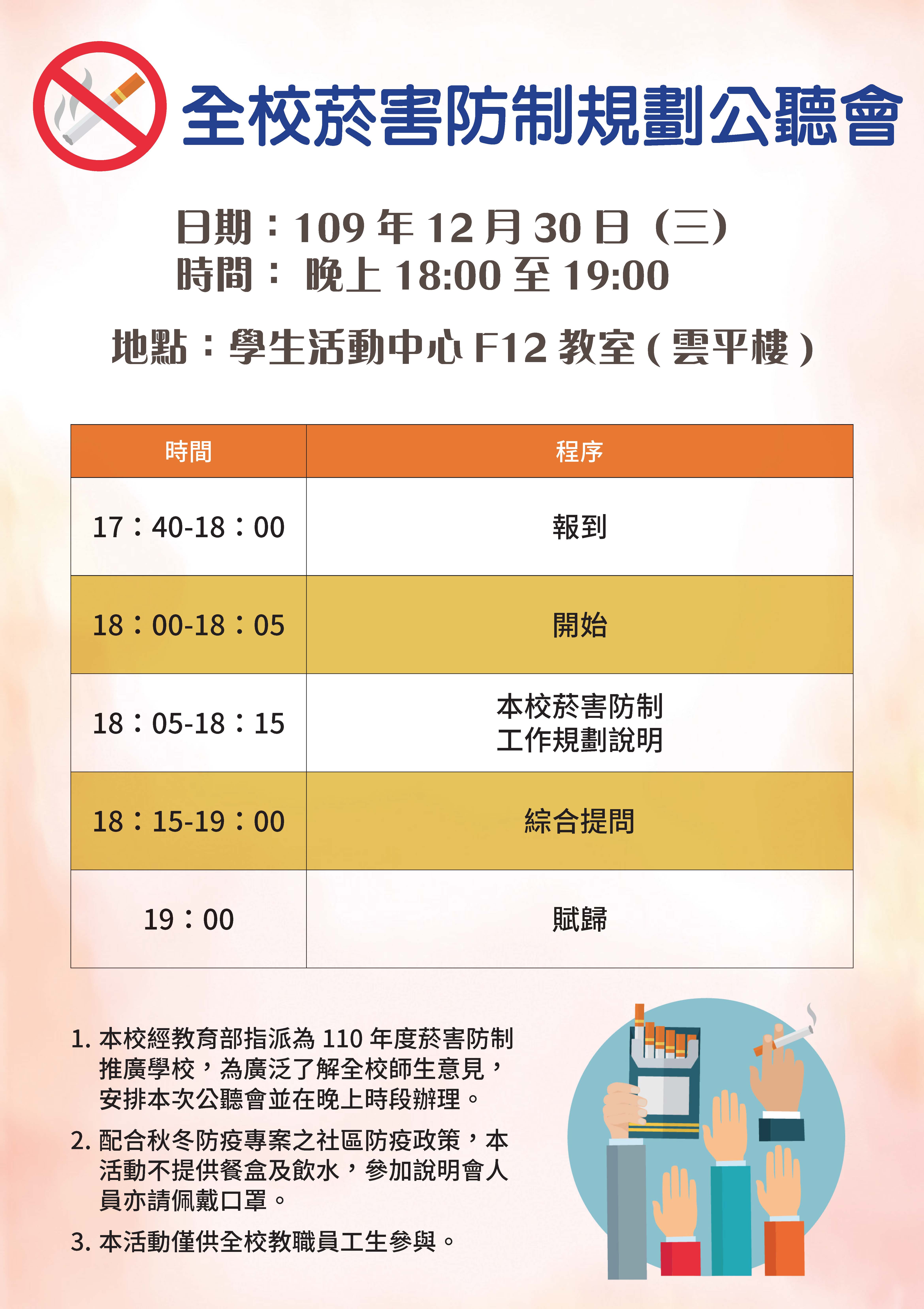 本校經教育部指派為110年度菸害防制推廣學校,為廣泛了解全校師生意見,謹訂於109年12月30日舉辦全校菸害防制規劃公聽會。