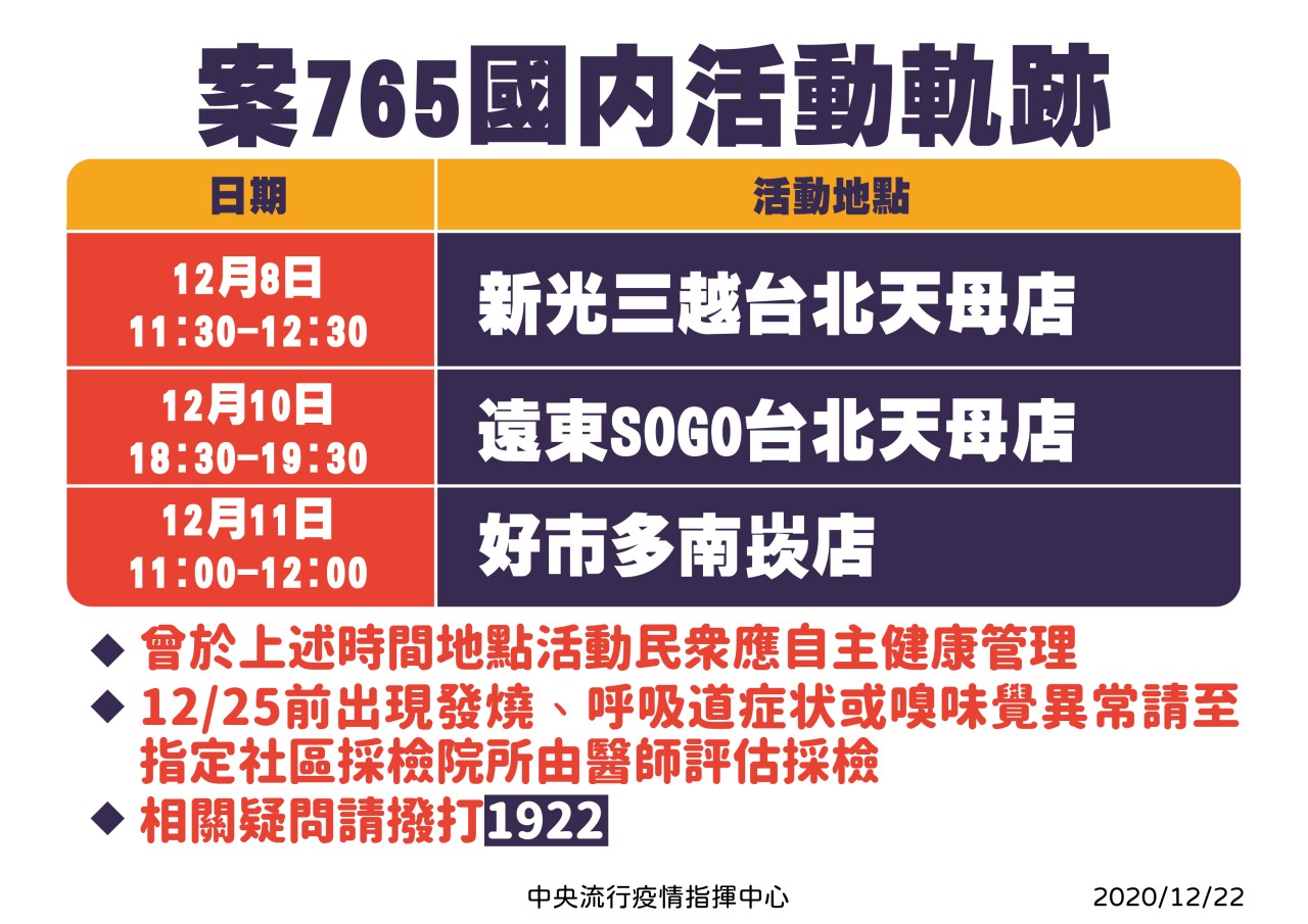 - 根據中央疫情指揮中心於22日公布國內新增1例COVID-19本土病例,提醒曾於下列時段出入相關場所的教職員工生,請自主健康管理。12月25日前如出現發燒、呼吸道症狀或嗅覺異常者,應戴上口罩前往全國指定社區採檢院所,經醫師評估是否採檢。敬請各單位防疫窗口轉發本訊息予所屬人員,若有軌跡與下列重疊(需自主健康管理者)且有症狀去做採檢者,均請通報健康及諮商中心以利列管。