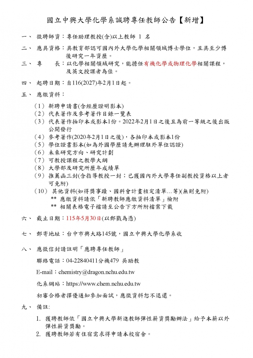 國立中興大學化學系誠聘 專任教師1名 (新增)
