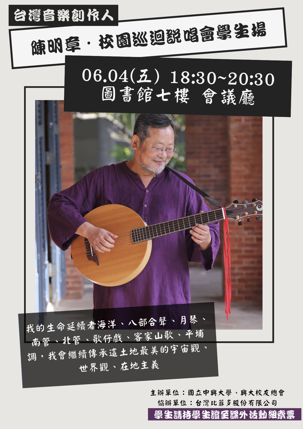 台灣音樂創作人陳明章先生6月4日於本校圖書館七樓國際會議廳,舉辦校園巡迴說唱會學生場,歡迎本校學生持學生證至課外組領票,配合防疫政策當日採實名制,請學生持學生證刷卡後入場,謝謝