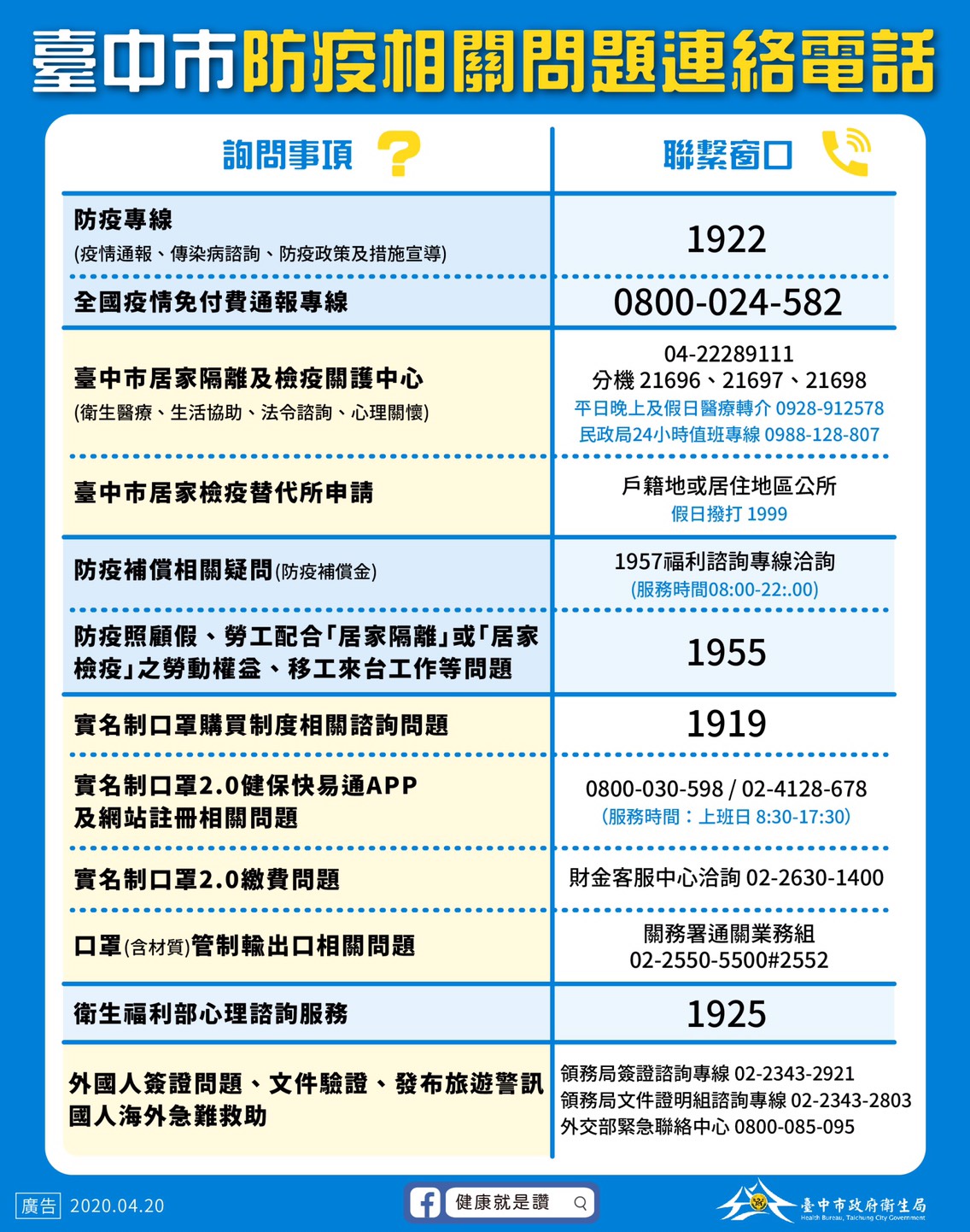 - 附件二:臺中市防疫相關問題連絡電話