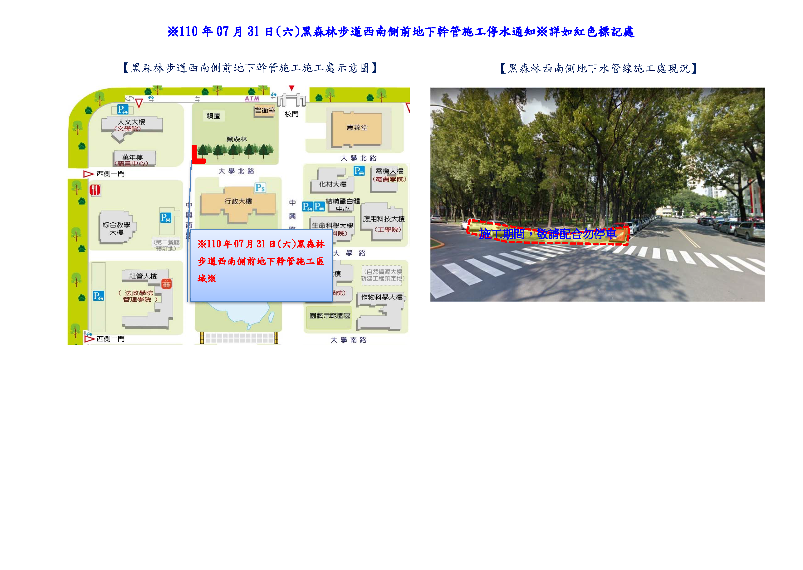 【營繕組施工通知】※110年07月31日(六)黑森林步道西南側前地下幹管施工停水通知※