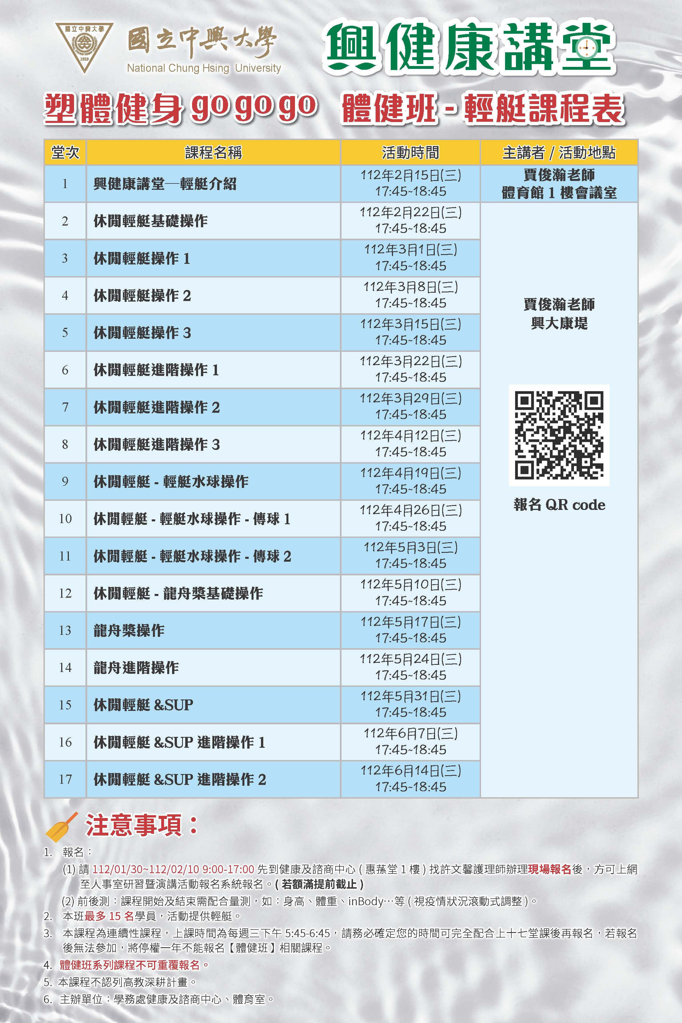 三、屬連續性課程,請務必確定您的時間可完全配合後再報名,若報名後無法參加,將停權一年不能報名【體健班】相關課程。