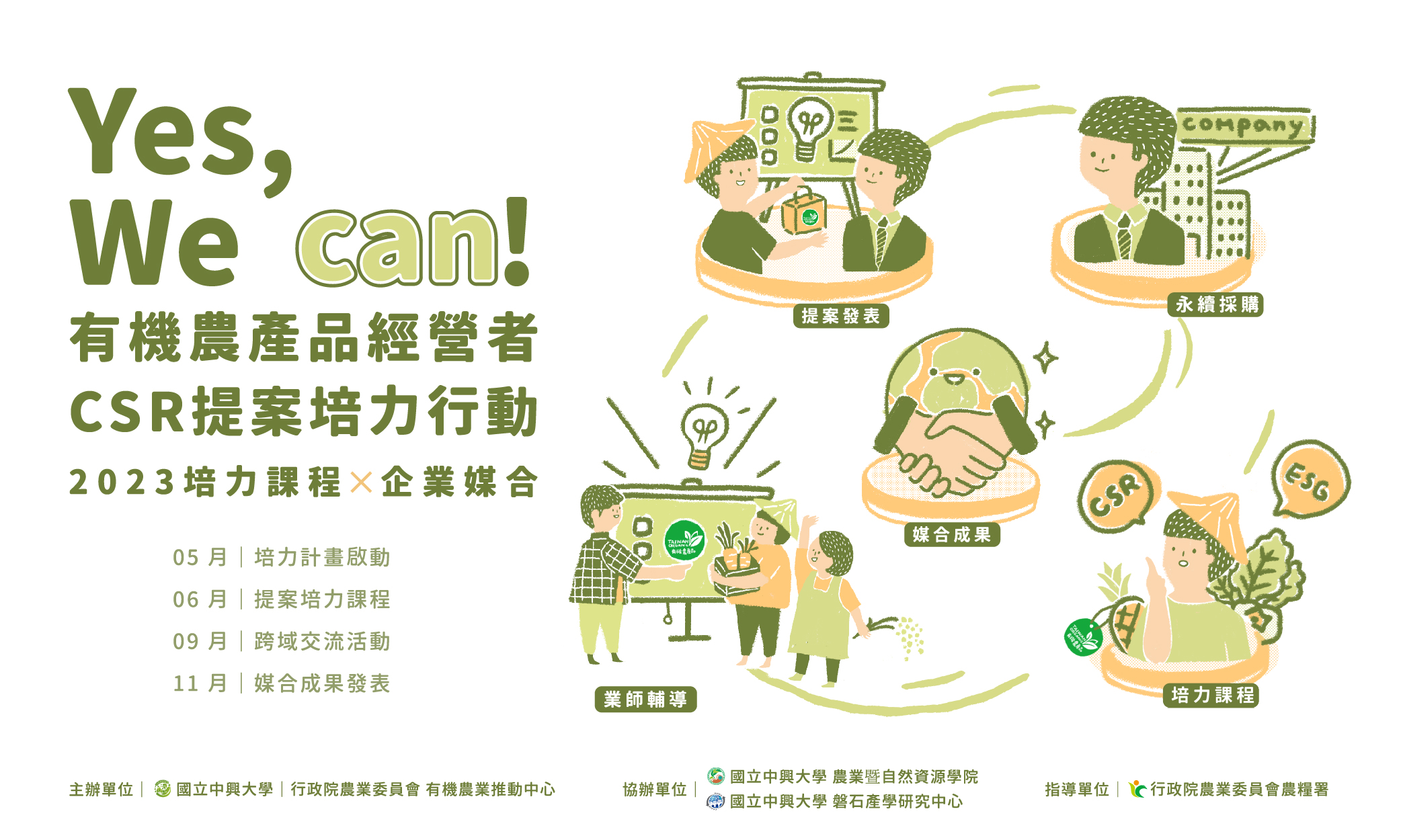 為了推動臺灣農業朝向永續發展,並促進與企業的合作機會,有機農業推動中心辦理「有機農產品經營者CSR提案培力行動」,活動包含培力主題課程及進階實戰工作坊,課程後續將安排跨域交流媒合會活動,展示學員成果,期能串聯多方資源共創合作,增加與企業採購媒合之機會,創造ESG淨零永續發展。