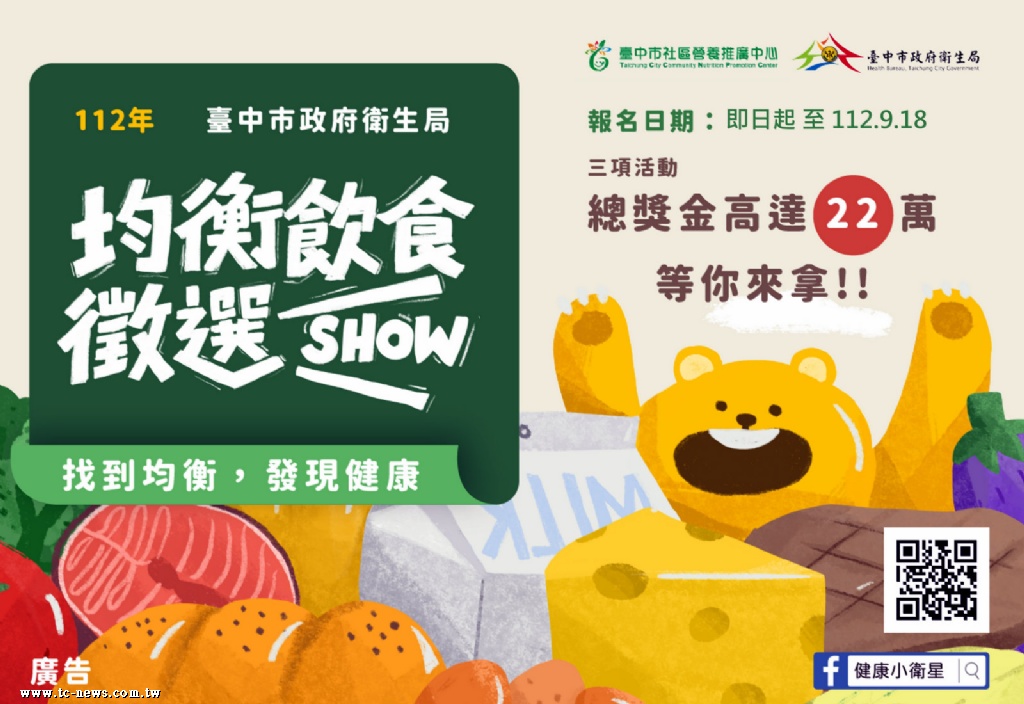 為鼓勵民眾將均衡飲食習慣落實於日常生活,臺中市衛生局委託沉魚文創有限公司辦理「均衡飲食徵選SHOW」活動,包含「一鍋到底,方便料理」創意食譜發想、「以全榖雜糧及未精製雜糧類或均衡飲食」為主題繪製四格漫畫,及三人(含)以上組隊報名「我的餐盤舞蹈秀」影片徵選活動,活動報名簡章路徑:臺中市政府衛生局局網首頁>公告訊息>最新消息,或活動網址:http://www.2023foodshow.com/,活動海報詳如附件。
