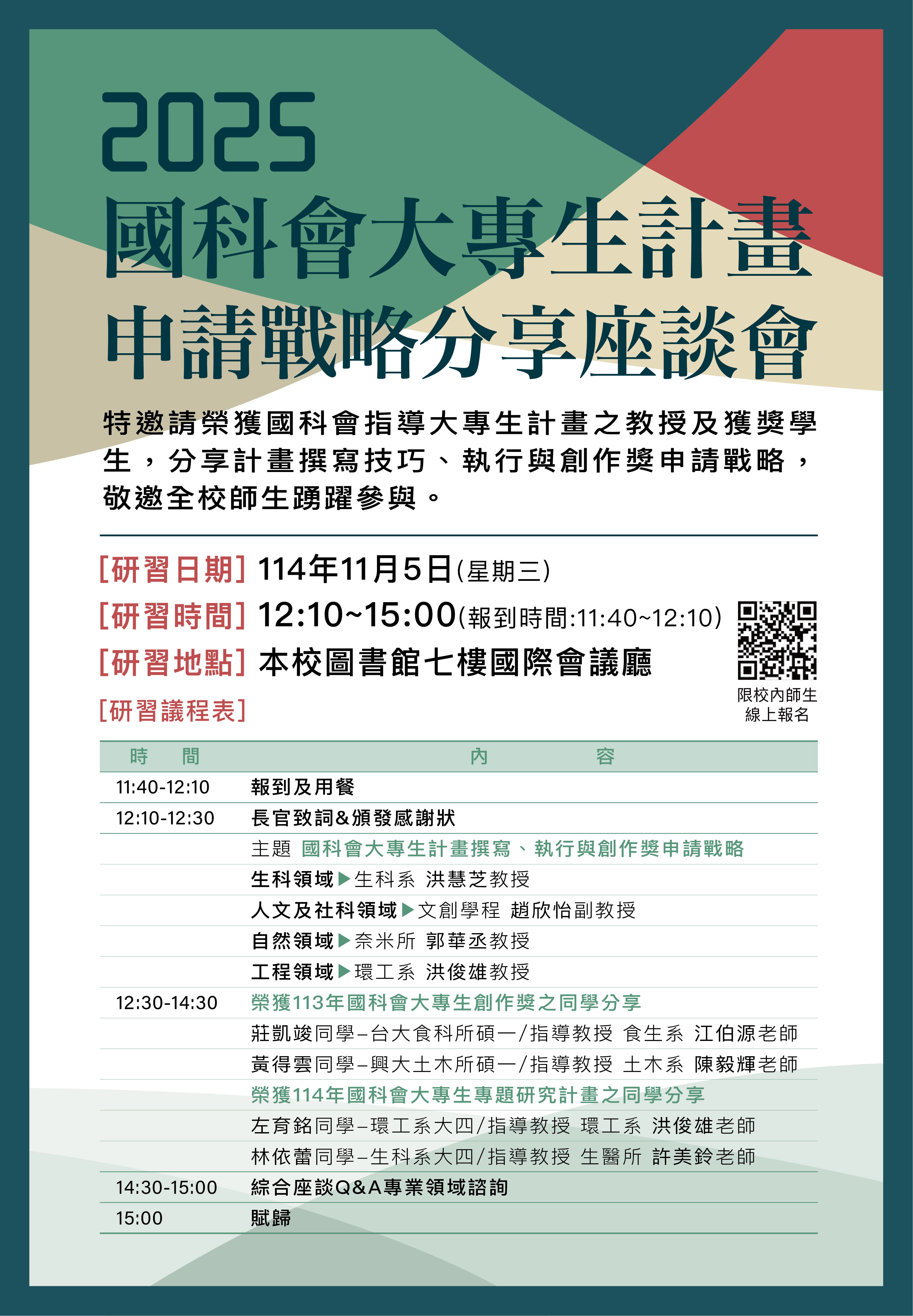 【研發處敬邀】本校研究發展處謹訂於114年11月5日(星期三)舉辦「2025年度國科會大專生計畫撰寫、執行與創作獎申請戰略分享座談會」,敬請惠予公告並轉知所屬師生踴躍報名參與。[Invitation from the Office of Research and Development] The Office of Research and Development of our university is pleased to announce that the “2025 NSTC Undergradu