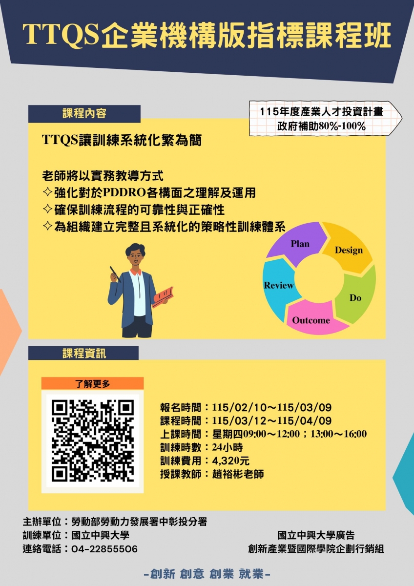 政府補助80%~100%--產業人才投資方案【TTQS企業機構版指標課程班】