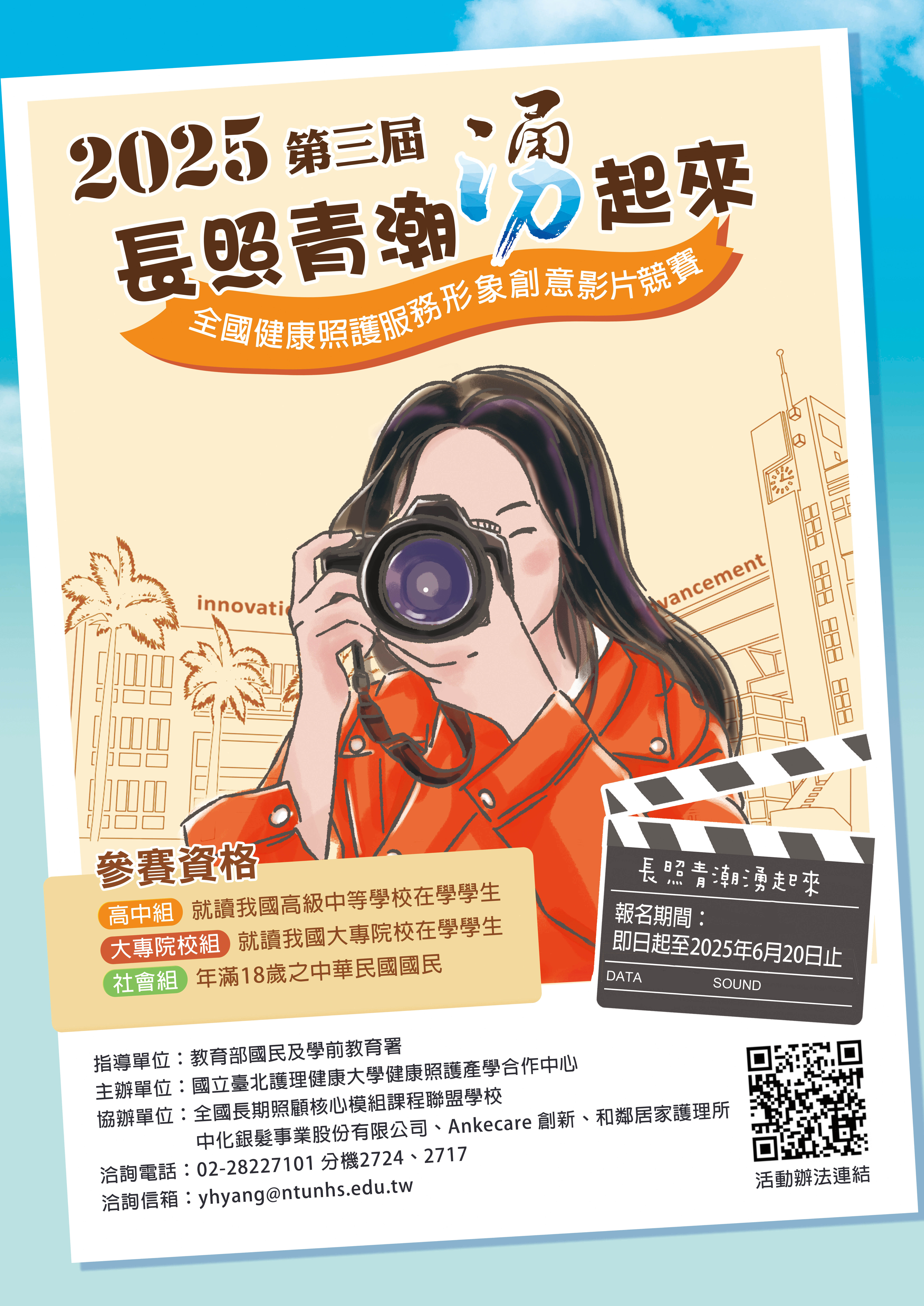 【轉知】國立臺北護理健康大學健康照護產學合作中心辦理「長照青潮湧起來~全國健康照護服務形象創意影片競賽」徵件活動,請師生踴躍報名參加。[Notice] NTUNHS "Long-term Care Youth Wave Rising - National Health Care Service Image Creative Video Competition." We encourage teachers and students to actively sign up and participate.