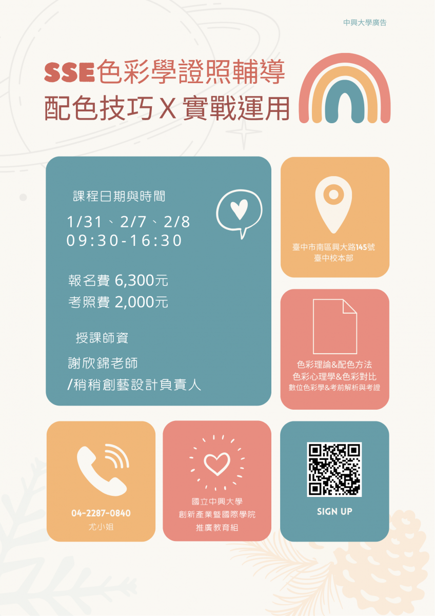 - 【SSE證照】 色彩學證照輔導 115/01/31、2/7、2/8,週六、日 09:30~16:30,共計18小時。