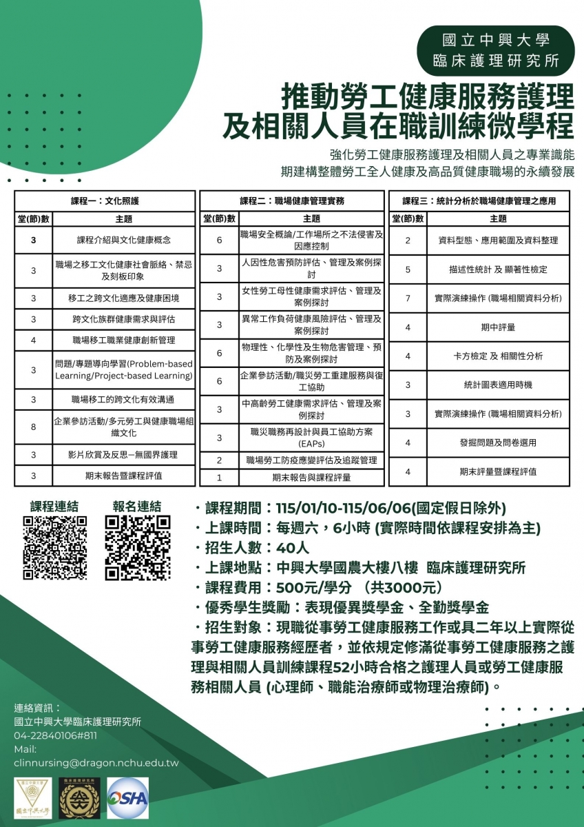 【學分班】推動勞工健康服務護理及相關人員在職訓練微學程